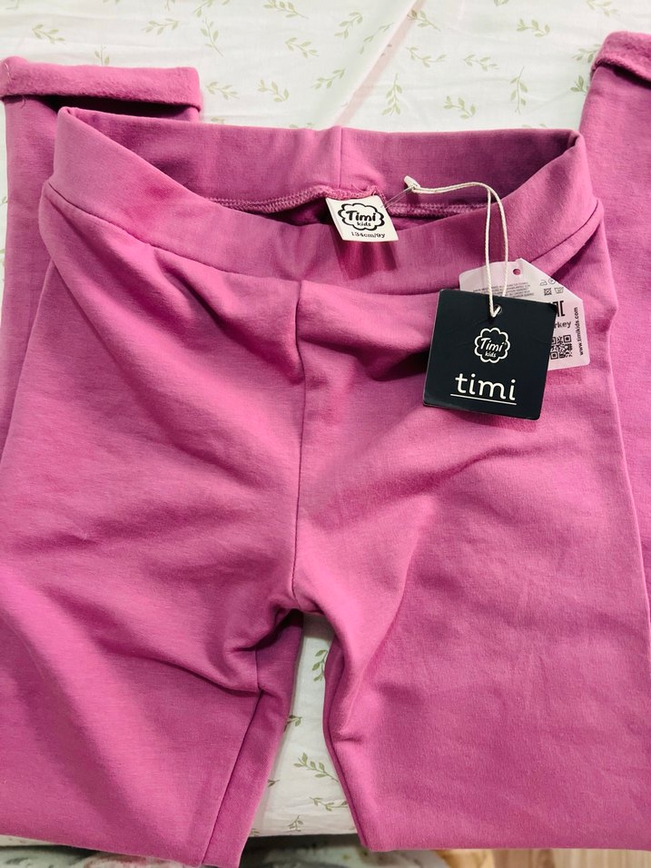 Yumuşak pamuktan yapılmış, elastik bel bantlı pembe kız çocuk taytı. Pastel normcore tarzında, Timi markalı. Belden 80 cm. İçi polarlı.