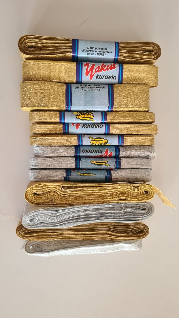 Altın ve gumiş renkte kurdeleler . 9adet hiç açılmamış diğerlerinden çok az kullanılmış 1cm 3cm 5cm