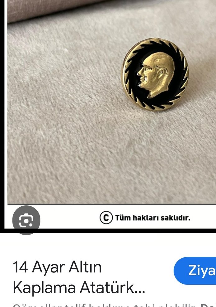 Erkekler için 14 ayar altın kaplama, Atatürk silueti bulunan parlak ve klasik tarzda rozet. Üzerinde "Tüm hakları saklıdır" yazısı yer alır.