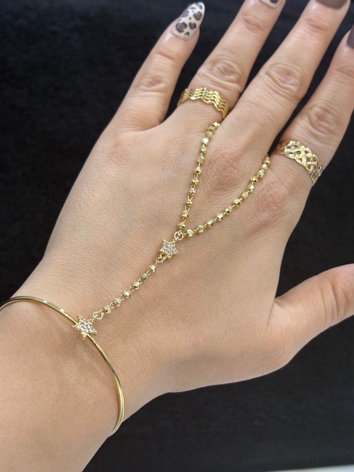 Minimalist ve bohem tarzda, zincir detaylı ve yılan deseni olan altın renk kadın el zinciri, düğün için uygun.