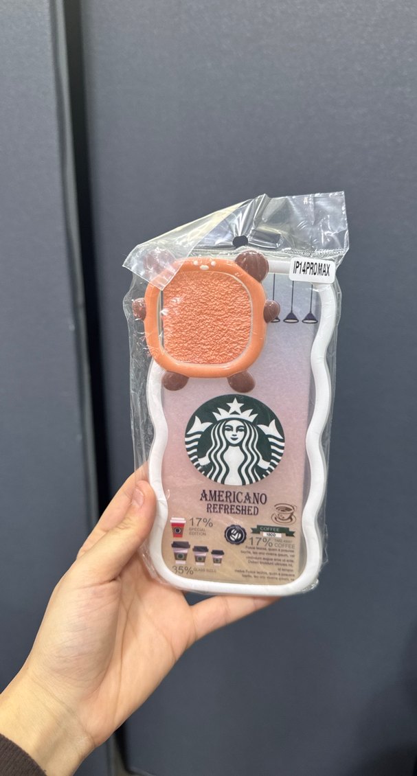 Pastel camel renkli, fermuarlı cep telefonu kılıfı. 'AMERICANO REFRESHED' yazılı, dokulu tutma alanı ve Starbucks temalı tasarıma sahiptir.