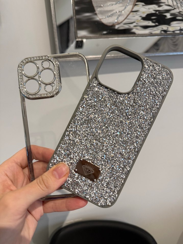 Gri renkli, payetlerle kaplı, çağdaş tarzda parıltılı telefon kılıfı, üzerinde dekoratif bir amblem bulunur. ✨ikili satışta