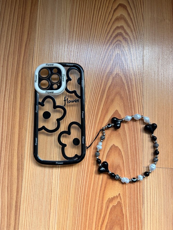 Siyah telefon kılıfı, büyük çiçek desenleri ve boncuklu bohem tarzı kayış ile kolay taşınabilirlik sağlar.