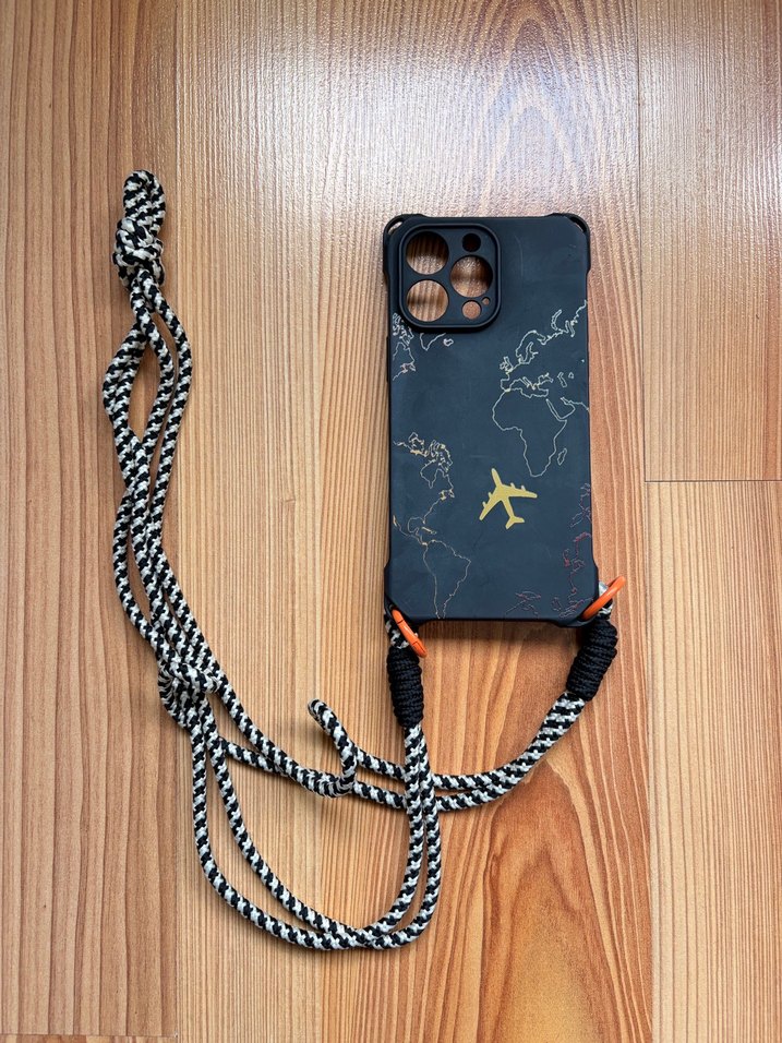 Siyah renkte, altın uçak ve dünya haritası detaylı bohem tarzda telefon kılıfı. Taşıma için zincir detayı bulunur. ✈️