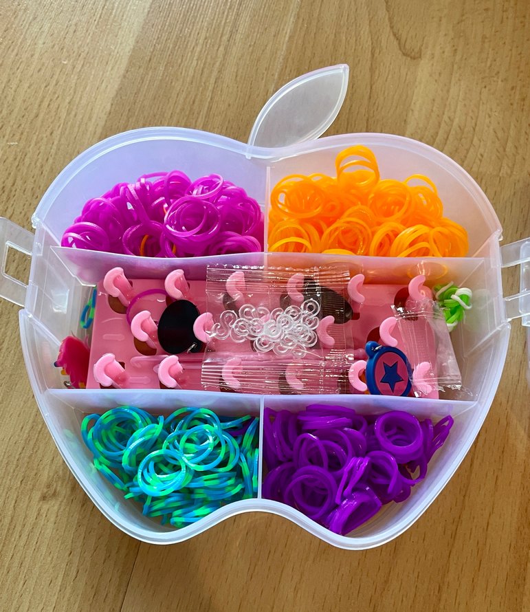 Elma şeklinde şeffaf kutuda, bölmeli ve saplı, 14 farklı renkli elastik bantlar ve aksesuarlar içerir. Yapma aparatı, birleştirme kancalarını ve birkaç çeşit charm içerir. Pazarlık yapılır.