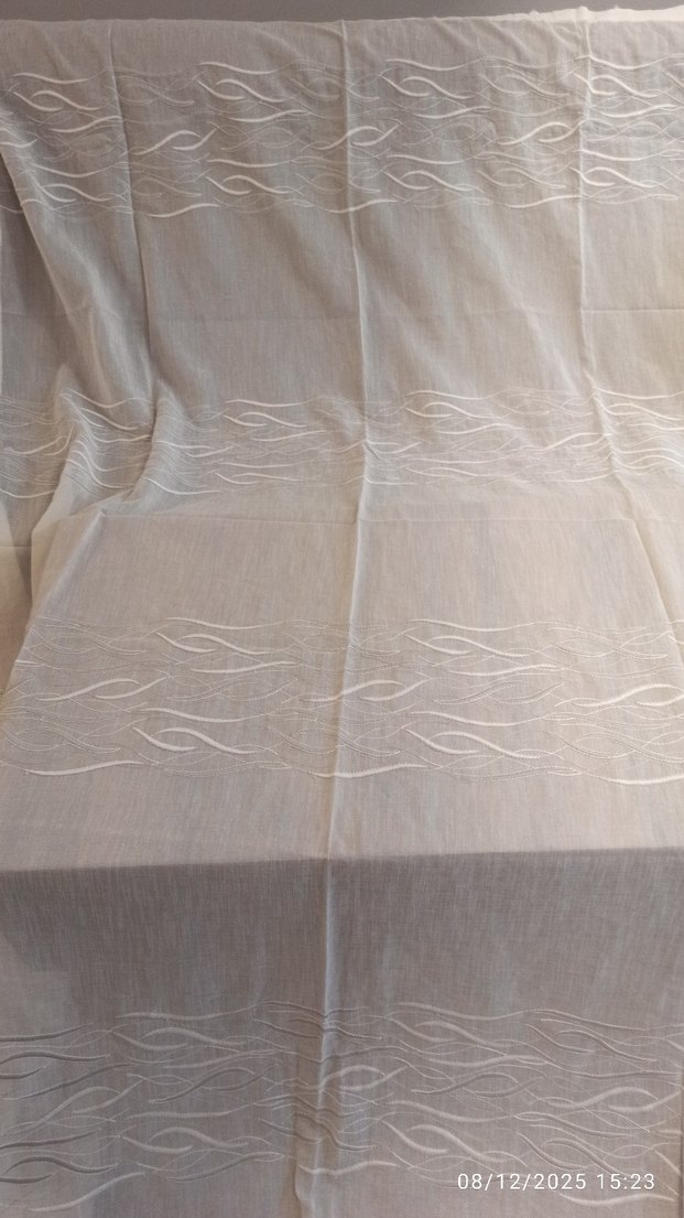 beyaz üzerine gri ve beyaz kabartma nakışlı keten tül perde.. eni 145 boyu 208 santimdir. balkonlar içinde uygundur..