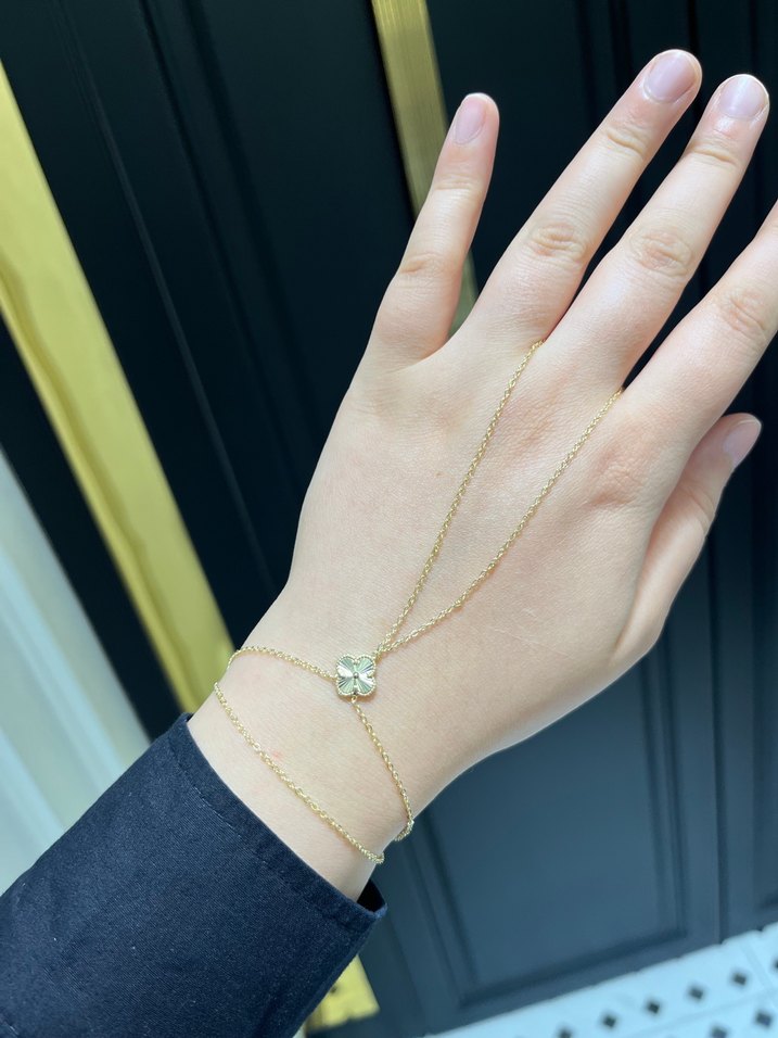 Altın renkli, ince zincir detaylı, küçük yonca figürlü kadın el zinciri, günlük kullanıma uygun bohem tarzda.