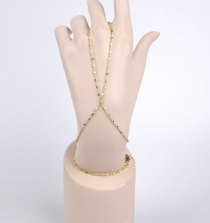 Altın renkli zincir detaylı kadın el zinciri. Minimalist ve bohem tarzda, günlük kullanıma uygun parlak yüzeyli aksesuar. ✨