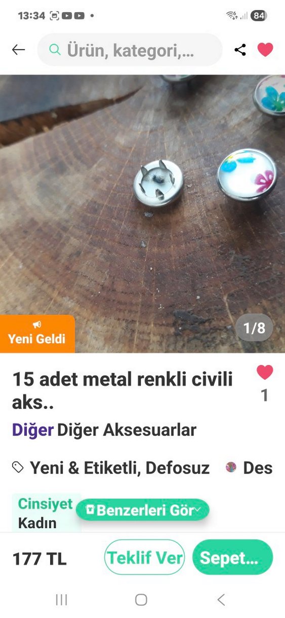 15 adet metal renkli civili aksesuar, beyaz tabanlı ve renkli çiçek desenli. Yeni, etiketli ve defosuz.