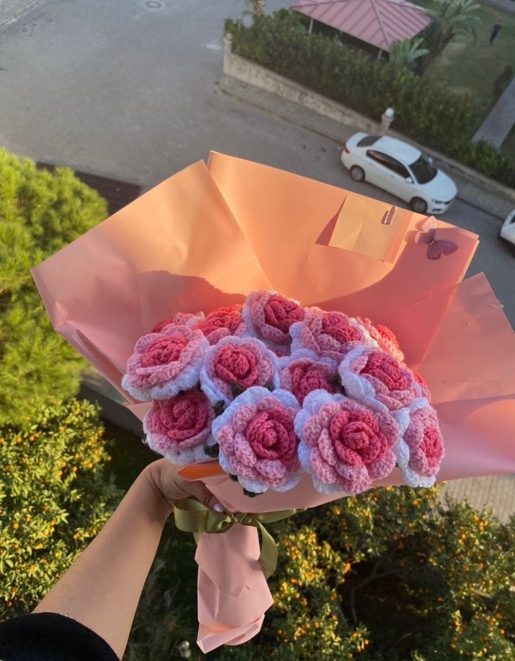 Yumuşak pembe kağıda sarılı el yapımı pembe örgü güllerden oluşan zarif ve şık bir buket. 15 adet çiçekten oluşmaktadırZ Gül kokuludur. Her bir çiçeğin uzunluğu 20 cm’dir.