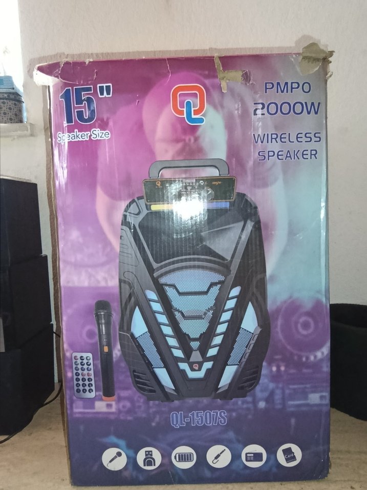 15 inç kablosuz mor Bluetooth hoparlör, 2000W PMPO gücüne sahiptir. Mikrofon ve uzaktan kumanda ile birlikte gelir.