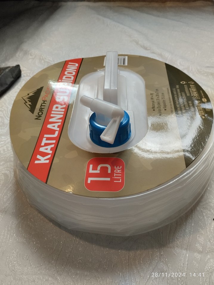 15 litrelik beyaz katlanabilir su bidonu, kolay dökme için mavi musluk ve gri sap içerir. Üzerinde 28/11/2024 tarihi bulunur.
