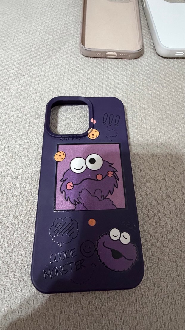Koyu mor renkte, şişkin dokulu ve pop kültür temalı, eğlenceli canavar ve kurabiye desenli telefon kılıfı. Üzerinde "MONSTER" yazısı bulunur.
