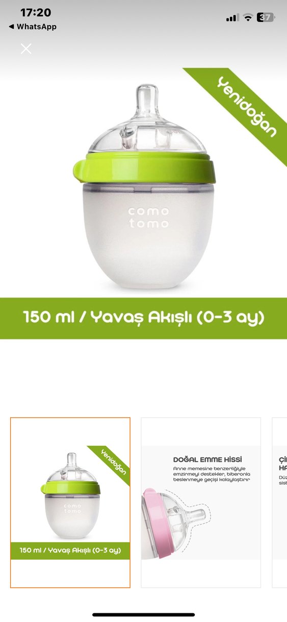 Yeşil renkli, 150 ml kapasiteli bebek biberonu. 0-3 ay arası bebekler için yavaş akışlı emzik içerir, doğal emme hissi sağlar.