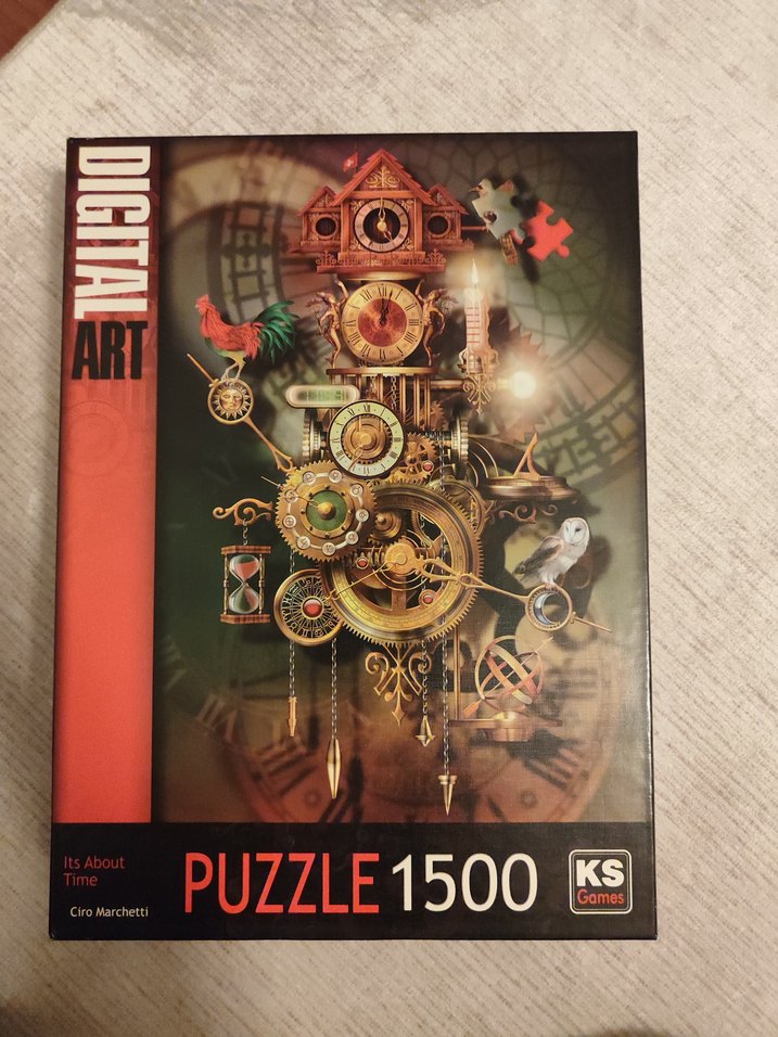 1500 parçadan oluşan bu puzzle, koyu ve altın tonlarda karmaşık saat mekanizması detayları içeren dijital sanat tasarımına sahiptir. KS Games markalıdır. pazarlık yapılır hiç açılmadı