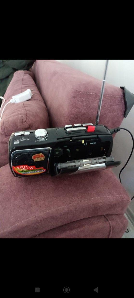 150W güç çıkışlı siyah müzik sistemi, AM/FM radyo ve antenli kaset çalar özelliklerine sahiptir.