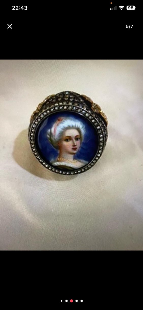 Fiyatı 155 bin tl Altın renkli vintage baskılı portre ve pırlanta ve inci işlemeleriyle süslenmiş, parlak ve özel bir düğün aksesuarı.
