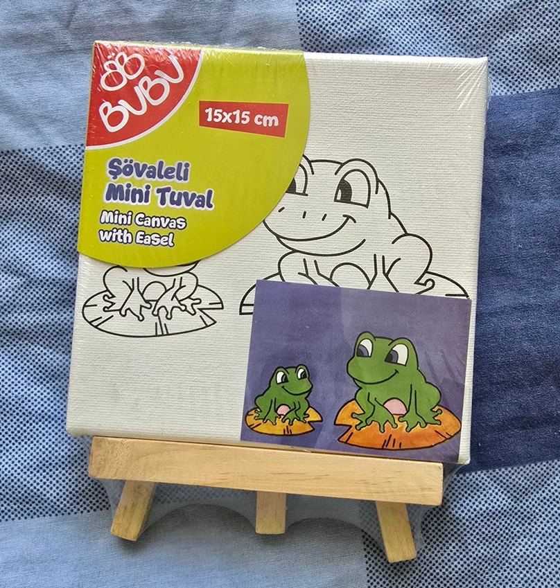 15x15 cm ölçüsünde, şövaleli mini tuval, çocukların boyaması için kurbağa desenli ve pastel renklerde.