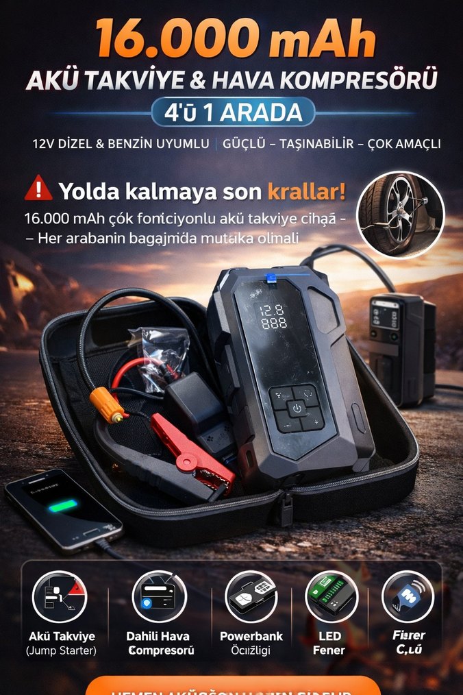 16.000mAh kapasiteye sahip, akü takviye, dahili hava kompresörü, LED fener ve powerbank özelliklerini bir arada sunan çok amaçlı cihaz. 12V dizel ve benzinli araçlarla uyumlu, taşınabilir ve kullanışlı. ⚡