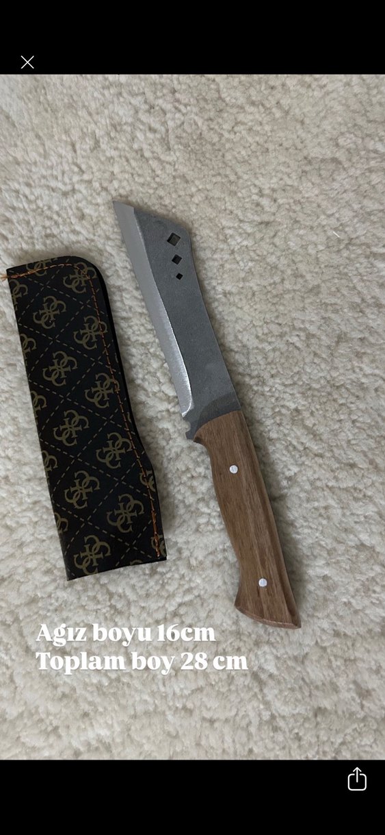 16 cm ağız boyu ve 28 cm toplam boya sahip, ahşap saplı ve koruyucu kılıflı bıçak.