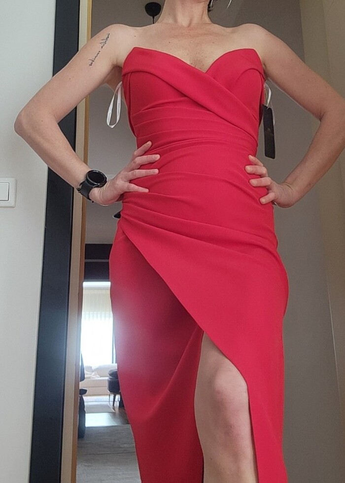 Kırmızı straplez midi abiye elbise 36 beden ama 38 uyumlu