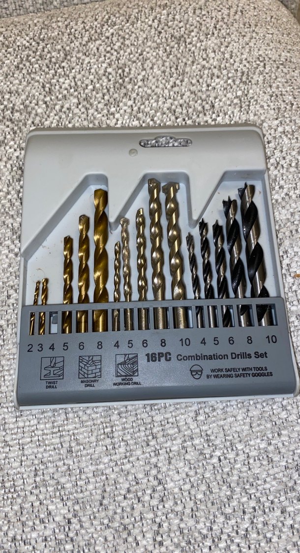 16 parçadan oluşan kombinasyon matkap ucu seti, farklı boyutlarda ve kullanım alanlarında uygundur. Son görselde gösterdiğim altın renkte olan eksiktir. toplam 15 adettir