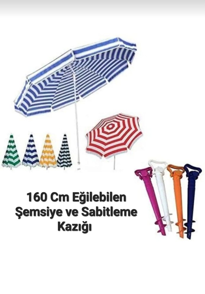 160 cm boyunda ayarlanabilir, çizgili desenli şemsiye ve elastik sabitleme kazığı içerir.