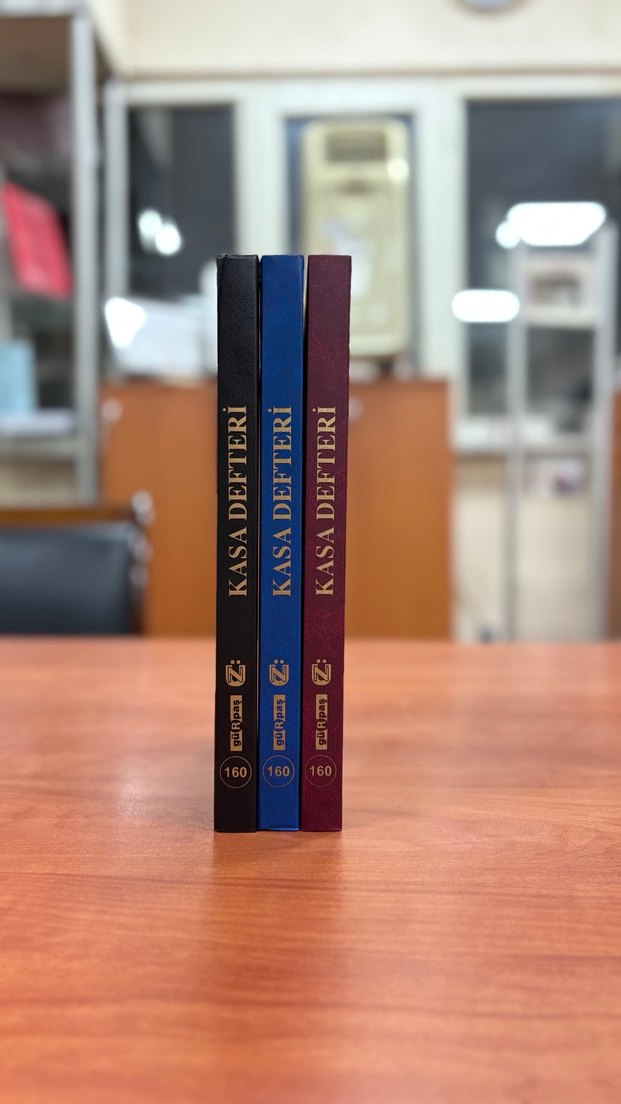 Siyah, mavi ve bordo kapaklı 160 sayfalık üçlü kasa defteri seti, muhasebe kayıtları için uygundur.