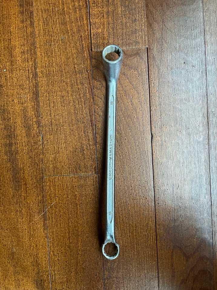 Somun ve civataları sıkmak veya gevşetmek için kullanılan gri ve bej renkli dayanıklı metal kombin anahtar. ️