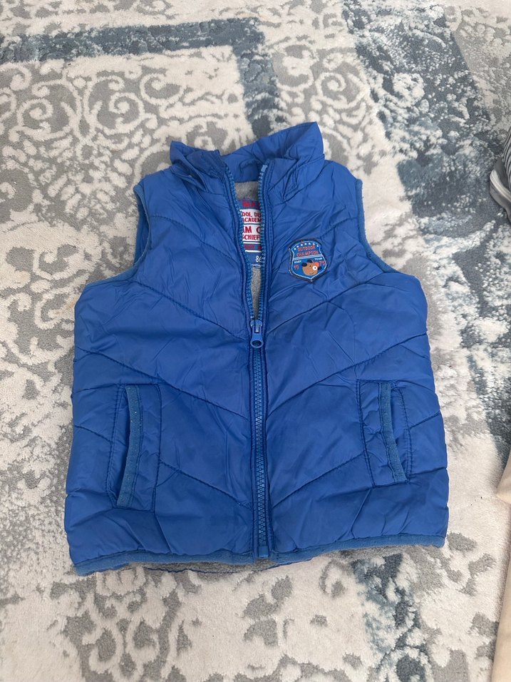 Mavi renkli, kürklü detaylı, yakalı ve kolsuz erkek çocuk yeleği. Sıcak tutan yumuşak kumaştan, rahat kesimle sokak stiline uygun.