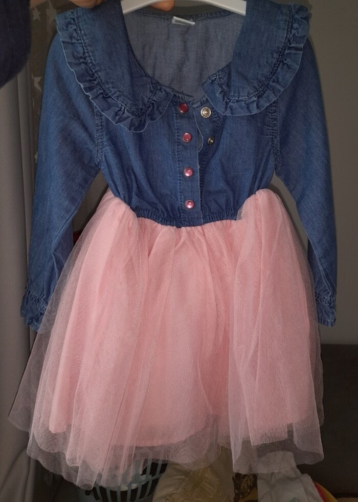 18-24 Ay pembe tül etekli kot elbise. Bebe yaka ve şık kol detaylı. 1 kez giyilebildi.