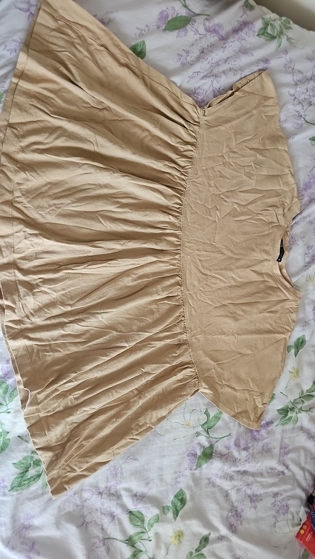 Bej renkte, keten kumaştan, bol kesim ve pileli hamile midi eteği, günlük kullanıma uygun.
