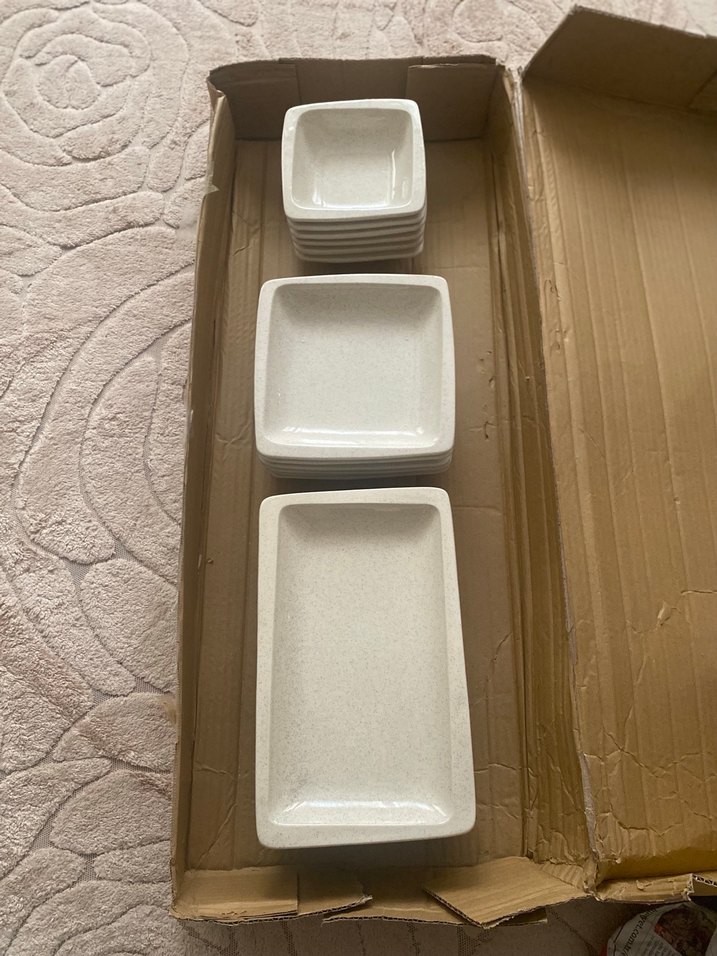 Çeşitli boyutlarda krem rengi ve simli seramik kare ve dikdörtgen yemek seti, yiyecek sunumu veya saklama için uygundur. ️ Kase 15x15 cm yükseklik 4 cm Orta boy 19x19 cm 3 cm Dikdörtgen 17x19 cm yükseklik 3 cm Her tabaktan 6 adet vardır hiçbir kusuru yoktur, sıfırdır.Toplam 18 parçadır