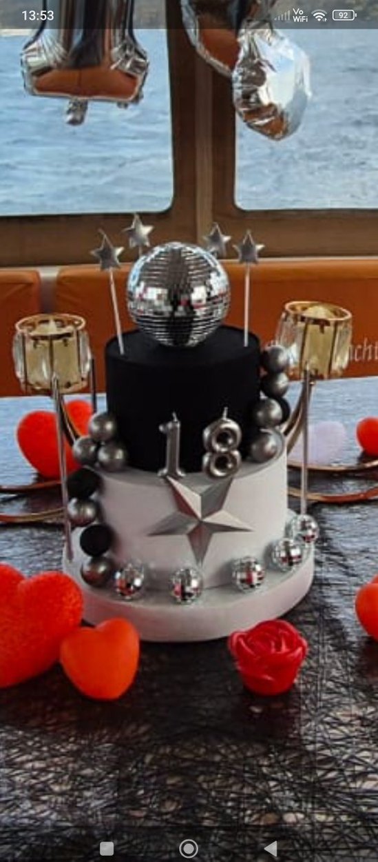 Gri temalı parti pastası dekorunda disko topu, gümüş yıldızlar ve 18 rakamı bulunur. isterseniz yaşı değiştirebilirsiniz kendinize göre özelleştirilebilir