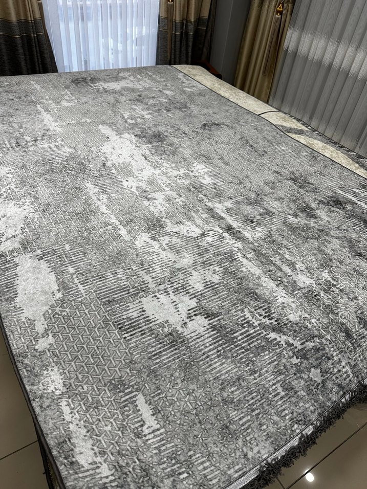 Çağdaş tarzda gri renkte, desensiz ve dokulu yüzeye sahip modern ve çok yönlü halı.