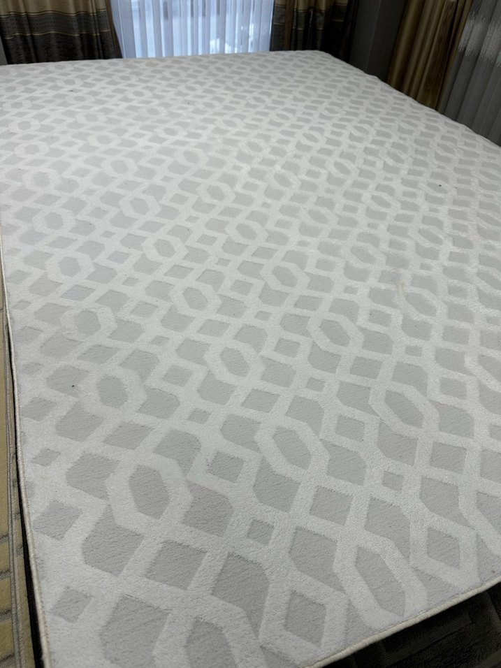 Beya renkte, çağdaş stilde, hafif geometrik desenli dokulu halı. Modern mekanlar için uygun.
