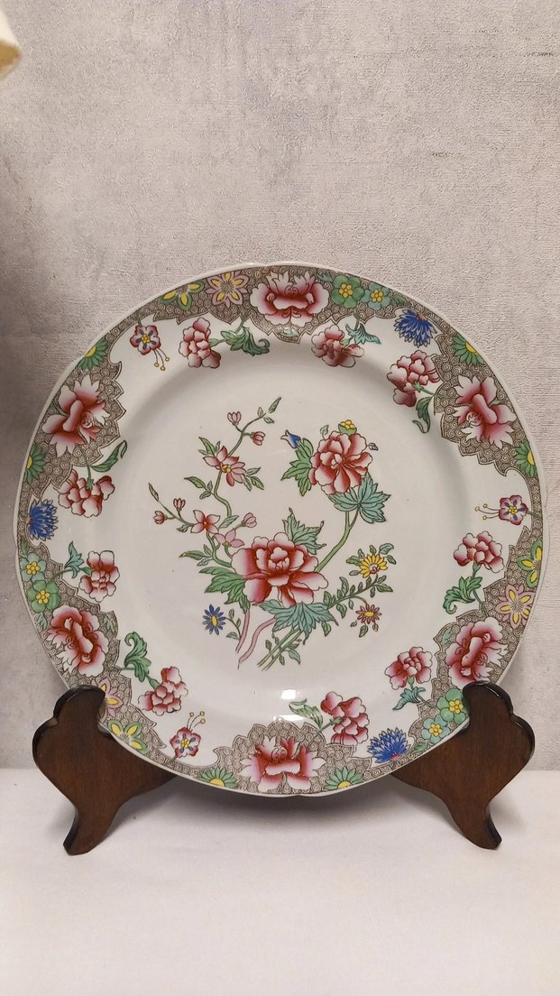 Uzun bir tarih yolculuğu_______ Nadir bulunan bu enfes antika tabak, üretilen ilk demirtaşı porselen parçalarından biridir. . . Bu koleksiyonu üreten Hicks and Meigh firması; 1805'ten 1830'ye kadar İngiltere'nin Staffordshire bölgesindeki Shelton (Hanley) şehrinde faaliyet göstermiştir. Bu tabağımızın desen numarası 1820'li yıllara aittir. Hicks and Meigh, yüksek kaliteli toprak seramik ve zengin desenli porselenler üreten, taş porselenin ilk ve önde gelen üreticilerinden biriydi. . . İki adet. Çok iyi durumda. Orjinal damgası ve işaret desen numarası /ayrıca araştırma sonucu damga dönem bilgisi fotoğrafları posta eklenmiştir. Çap 24*24cm/Oryantal kenar formlu. Famille rose 'şakayık gülü' deseni elle boyanmıştır. Baskı işaret desen numarası 3125. Damga işareti 1820 senesi aittir. İster duvar dekorasyonunda sergileyebileceğiniz ister sunumlarınızda kullanabileceğiniz hikayesiyle muhteşem parça....