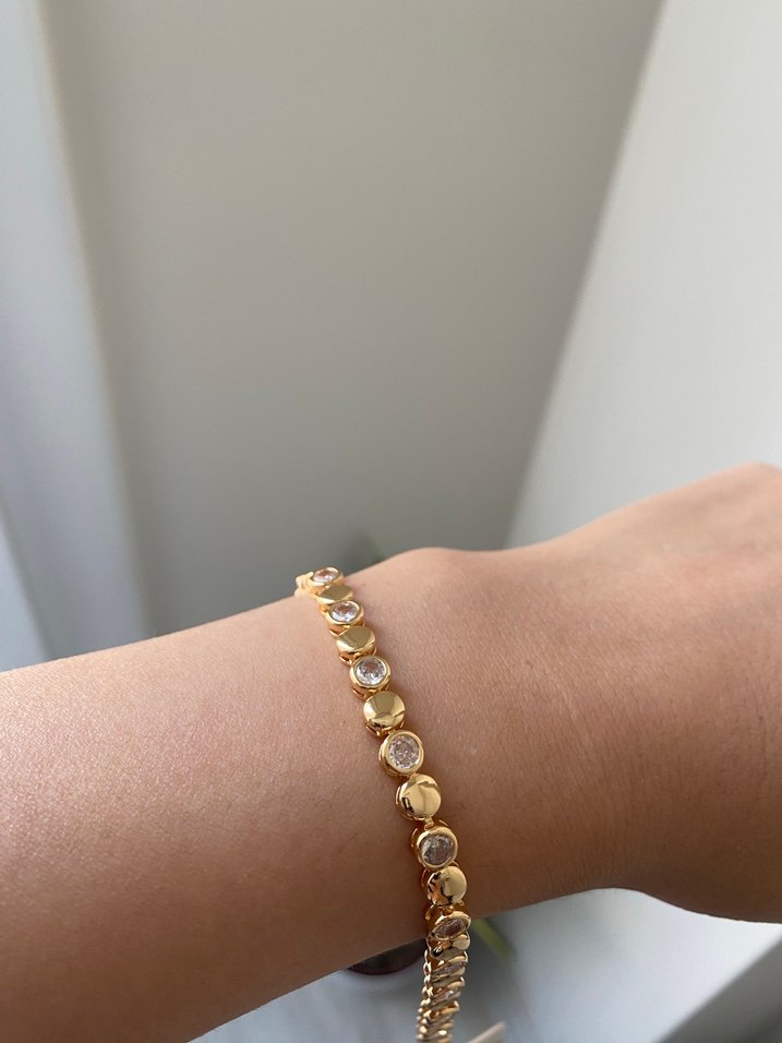 Altın renginde zincir detaylı, puantiyeli ve şeffaf taşlı modern tasarım bileklik, günlük kullanıma uygun. ✨