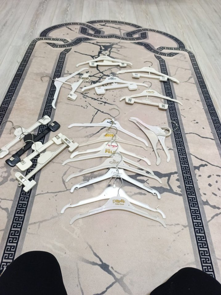 19 adet bebek çocuk kıyafet askısı . 10 adeti düz aski 4 adeti etek pantolon askısı 5 adeti de etek pantolon askılikli düz askidir. hepsi tertemiz deformesi yoktur.