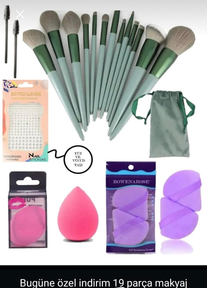 Farklı boylarda 19 parça makyaj fırçası, pembe makyaj süngeri, mor kozmetik süngerleri ve yeşil saklama çantası içerir. Ayrıca tırnak stickerları da dahildir.