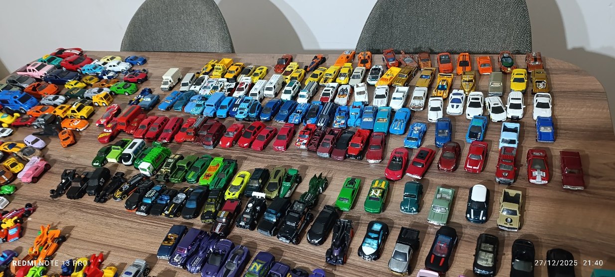 Çeşitli modellerde ve canlı renklerde düzenli sıralanmış renkli oyuncak araba seti.