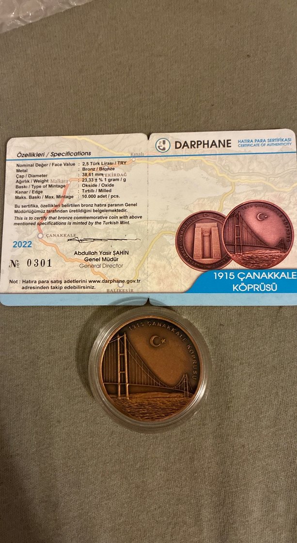 2022 tarihli, bronz malzemeden yapılmış 1915 Çanakkale Köprüsü hatıra parası. 38,61 mm çapında ve Darphane sertifikalıdır.