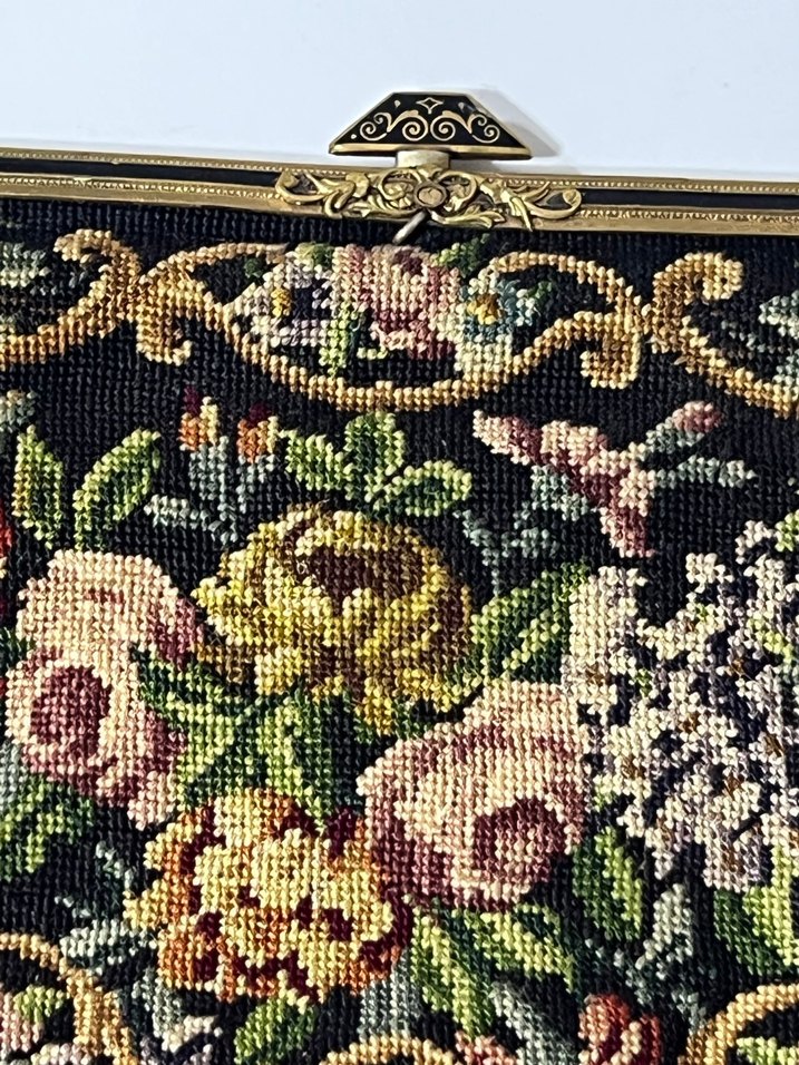 • El dokuması goblen yüzey • Pirinç döküm, floral motifli patentli çerçeve • Orijinal Avusturya damgalı zincir askı • Dönemine uygun aşınma (patina), yapısal sorun yok