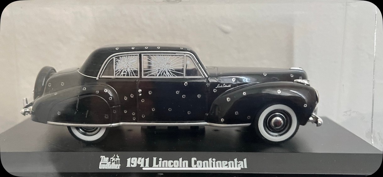 Bu siyah oyuncak araba, üzerinde detaylı kurşun deliği desenleri bulunan 1941 Lincoln Continental modelidir.