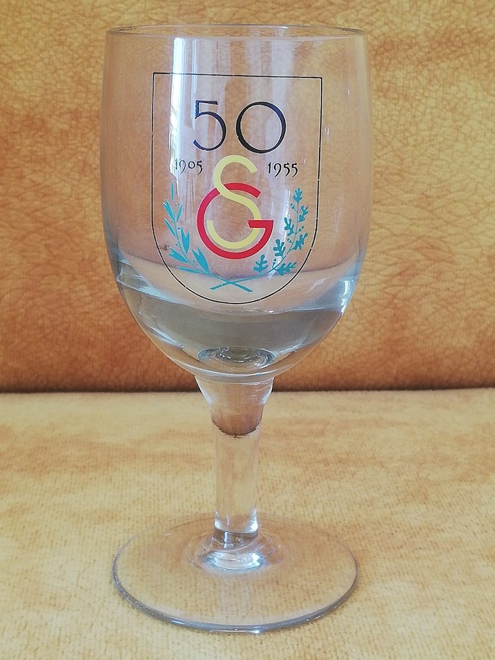 Galatasaray logosu ve 1905-1955 yıllarını taşıyan, renkli ve altın detaylı 50. yıl anısına antika özel kadeh. meraklısına