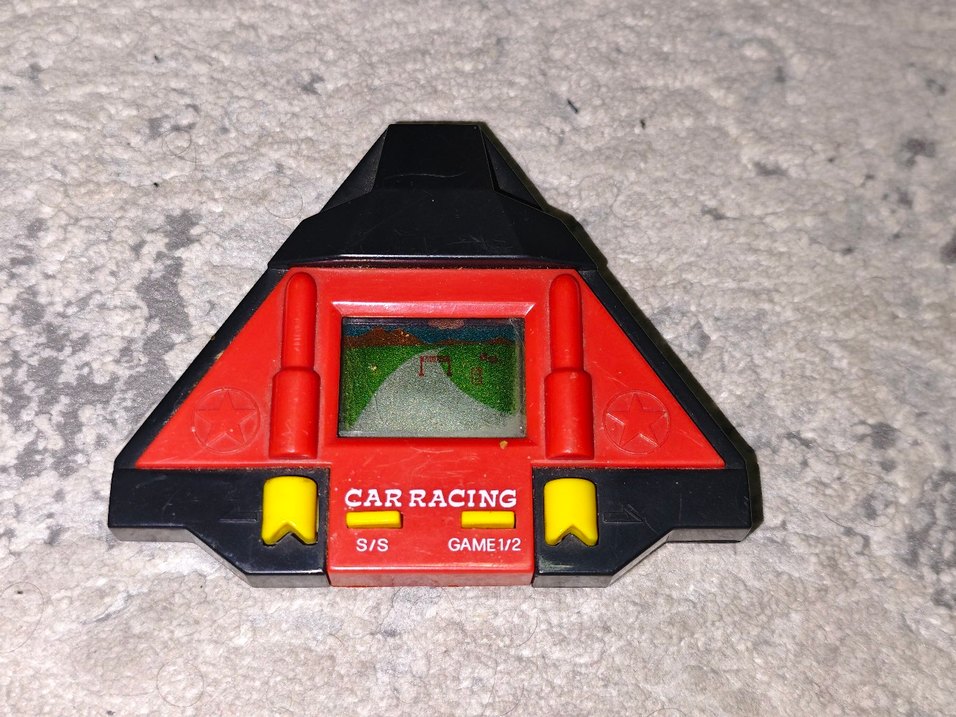 1980-90 lı yıllar Car Racing Oyuncak Araba Küçük ekranda yarış pisti gösteren, üzerinde GAME1/2 ve S/S yazılı kontrolleri bulunan koyu kırmızı Car Racing oyuncak araba.