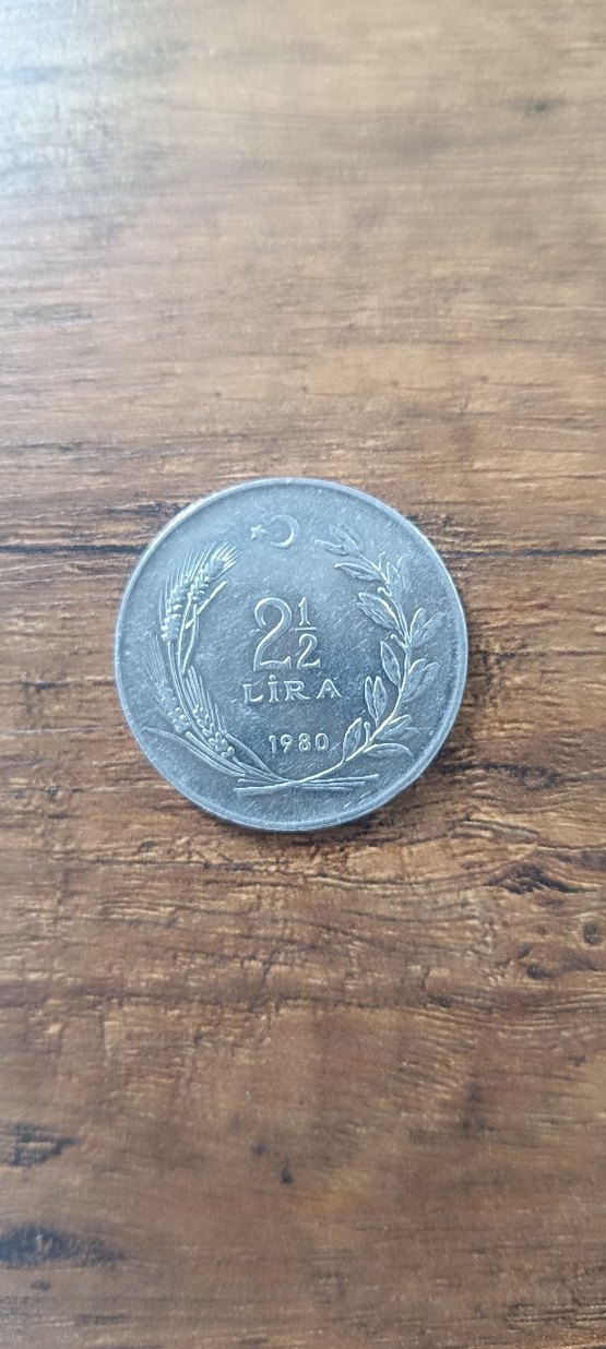 1980 tarihli gri renkte, 2,5 Lira değerinde madeni para. Ay ve yıldız ile çevrili geleneksel tasarıma sahip, yaşa bağlı kullanım izleri bulunur.