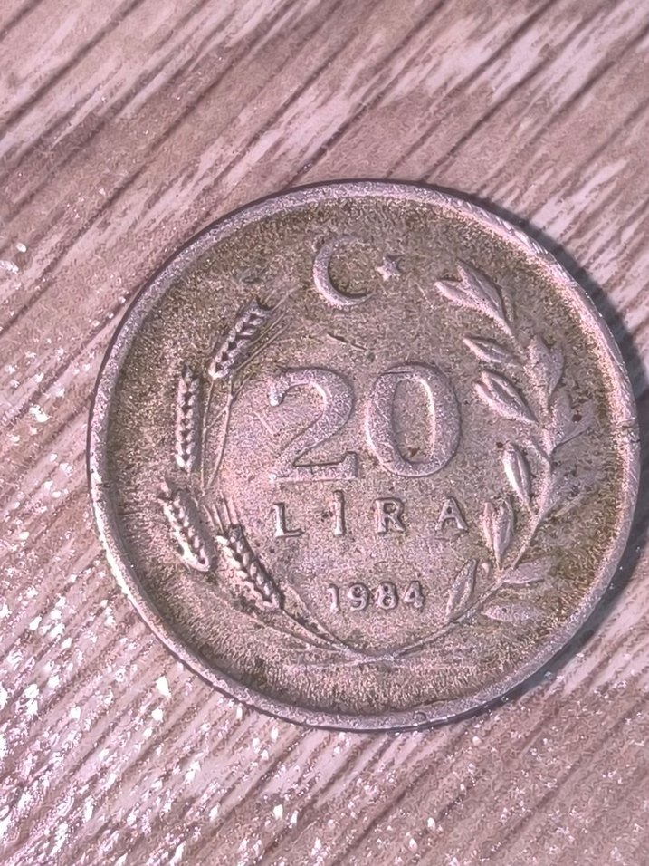 1984 tarihli, geleneksel Türk sembolleri taşıyan, gri-kahverengi tonlarında vintage 20 Lira madeni para. Tarihi ve koleksiyonluk değeri vardır. Cumhuriyet dönemi orjinal kondisyonu iyi durumda nadir bulunan ürün koleksiyocularin gozdesidir.kacirmayin