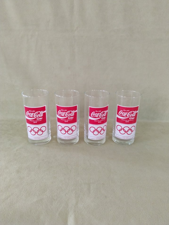 Renkli, üzerinde Coca-Cola ve Olimpiyat halkaları bulunan 4'lü bardak seti. #retro #vintage #popart #antika