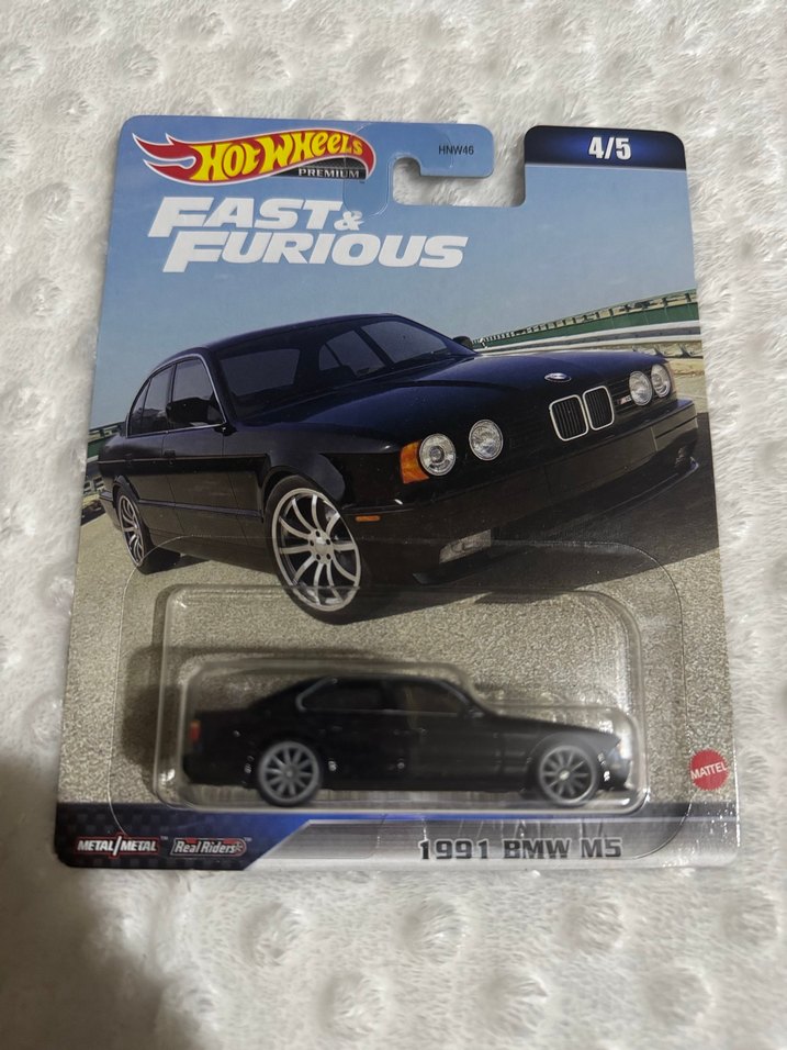Hot Wheels Fast & Furious serisinden siyah 1991 BMW M5 oyuncak araba, detaylı tasarım ve gerçekçi tekerleklerle. Koleksiyonun 4/5 parçası.